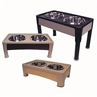 The OurPets Signature Series Designer Diner offers your dog an ergonomically correct way to have meals. By raising the food and water to a more comfortable height, eating eases back and neck strain and reduces stress on joints and bones, while improving digestion and posture. Black with reversible stainless steel-looking panels. Advanced modern design fits into your kitchen's décor. Includes 2 easy-to-clean stainless steel bowls. 5-year warranty.