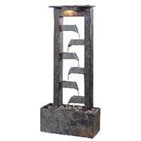 (More customer reviews)This fountain is exactly what I was looking for to put in our sun room. It is the perfect height and size, and the slate finish is beautiful. The best thing about this fountain is the sound..it truly sounds like a flowing river. You can actually hear the water flowing- which is the whole point for a fountain!! I researched SO many other fountains out there- and this one seemed to be the best quality for appearance and sound. NO one has it cheaper than Amazon! Pros- easy to put together, river like sound, elegant/simple look, sturdy, no pieces that can break or fall off easily and the light has its own on and off switch. I am very happy with this purchase and would recommend this fountain for any room in your office or home.