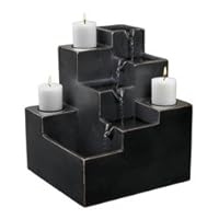 Painted a sleek black, the fountain was crafted out of durable resin with plastic washers on its base. Three 2-1/8-inch diameter trays, constructed out of black-painted steel, come with the fountain for use on the flat-surfaced cubes. In the trays, place votive candles, seashells, or polished river stones for an added decorative touch. A pound of polished river stones accompany the fountain. Designed for indoor use only, set up the fountain on a water-resistant surface as it may sputter when first turned on. As the fountain includes small parts that pose a choking hazard, keep it out of the reach of children under three-years of age. Upon delivery, the fountain requires basic assembly. Assembly directions are provided. The assembled fountain measures 10-1/4 inches wide by 10-1/4 inches deep by 12 inches high.